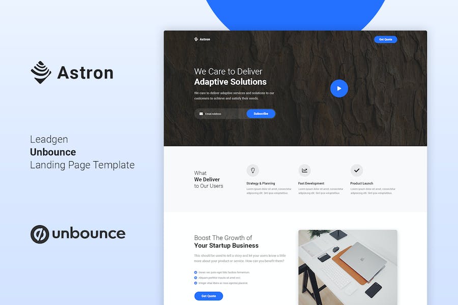 Astron is Lead Generation Unbounce Landing Page Template. It can be used to promote your services,It has some features which will help you make your project stand out from the crowd. It has been optimized to facilitate your time and money. It is well documented which will help you to get your site running easy and fast. You can customize it very easy to fit your business needs. We hope you like it!