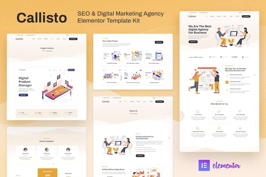 Callisto is a modern ready-to-use Elementor Template Kit specially designed for Digital Marketing Agencies,SEO Agencies,Online Marketing,SMM experts,Web Studios,Advertising Agencies,Lead Generation specialists,and other Marketing Firms. Attract clients with a fresh design,present services with eye-catching illustrations to get more attention.