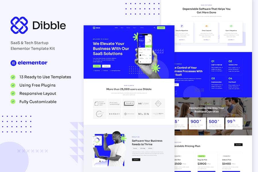 Dibble - SaaS & Tech Startup Elementor Template Kit created especially for SaaS,Software,Services,Startup,Tech Website and other similar businesses. Dibble has a simple,modern and clean design with 100% responsive layout,and very easy to customize and can be used by anyone without having to understand coding.