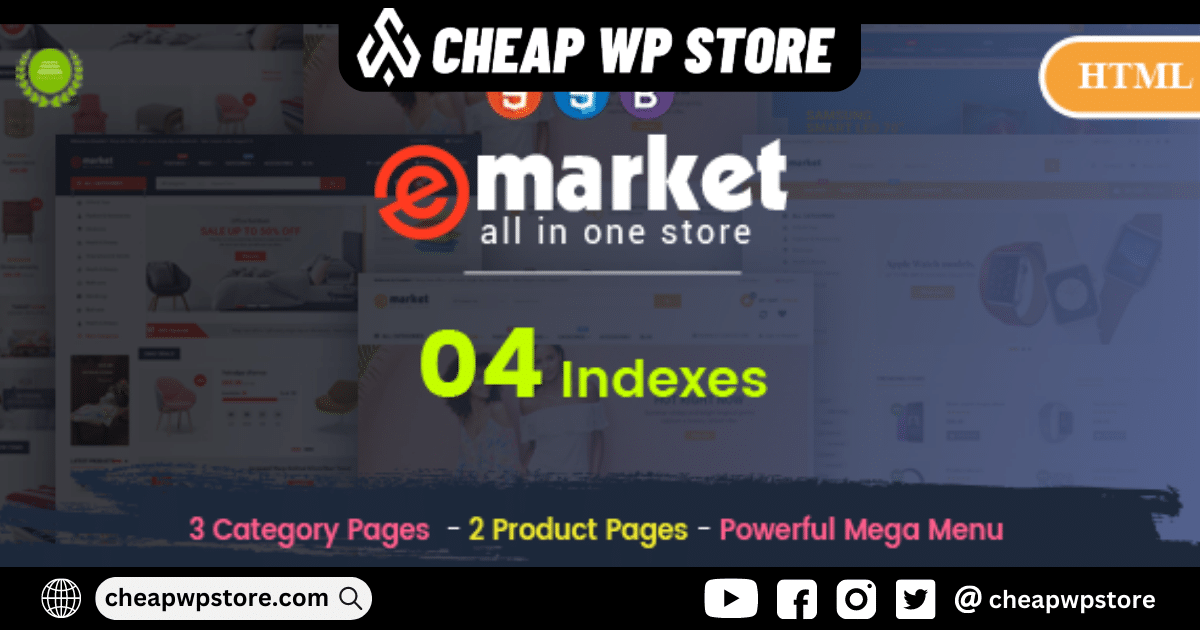 eMarket - Creative Responsive MultiPurpose HTML 5 Template (Mobile Layouts Included) is a versatile and stunning boilerplate that is perfect for creating online stores and various businesses. Its modern style and clear layouts make it an easy-to-use template for anyone who wants to sell any kind of items they wish. With 4 modern and clean homepages,eMarket provides a wide range of options to match the purposes of any user.nnBuilt with Bootstrap 3,Compass,and CSS,this HTML 5 theme has clean and valid code,making it fully responsive on any device. The PSD is also included in the package,allowing you to customize the design according to your preferences. eMarket also has a product quick view feature,cross-browser optimization,and a product owl carousel slider that enhances the user experience.nnOne of the standout features of eMarket is the mega menu support and mega vertical menu that makes navigating the site more convenient. The template also offers list and grid view options for products,with product pages available in two styles and category pages in three styles.nneMarket is an extremely customizable HTML 5 template,allowing you to make your website stand out with your own personal touch. The template is easy to modify,with free fonts and icons,valid HTML5 and CSS3 files,and well-documented instructions.nnThe clean and professional design of eMarket provides a polished look to your website,making it stand out among competitors. With so many features to offer,such as the product quick view,mega menus,and customizable design,eMarket is a top choice for anyone looking to create an online store or business website.nnIn summary,eMarket is a stunning HTML 5 template that offers a wide range of features and customization options. Its clean and professional design,along with its ease of use and fully responsive layout,make it an excellent choice for anyone looking to create an online store or business website. Don't miss out on this fantastic template,as it's one of the best themes out there!