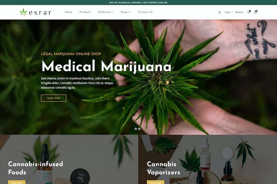 Esrar is a modern Marijuana and Cannabis Shopify Theme created for recreational medicine,marijuana shop,CBD Oil and marijuana dispensary,medical cannabis store,cannabis blogging and others. The theme contains all the necessary pages to create an online CBD shop.