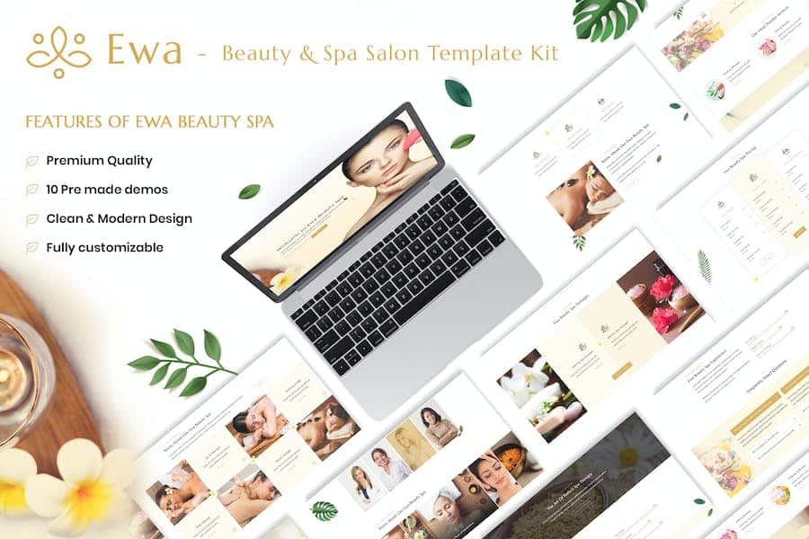 Ewa - is a powerful and responsive elementor template kit for beauty & salon spa. With the help of this template kit ( around 26 sections ) you can create websites for Beauty,Spa,Salons,Yoga,Barbershop,Care,Hair,Health,Massage,Physiotherapy,Wellness Center,Makeup,Therapy,Cosmetic,Treatment and personal website.