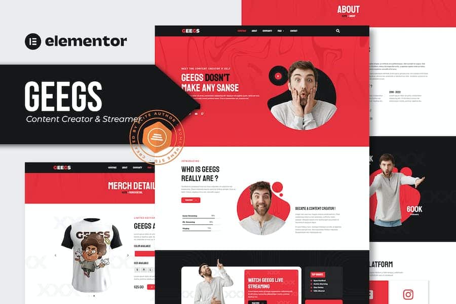 Geegs - Content Creator & Streamer Elementor Template Kit. Geegs is a fully responsive,clean and customizable theme. Geegs can be used for Content Creator,Streamer,Gamer as well as layouts for Merch Detail to show their cool,beautiful and amazing project.