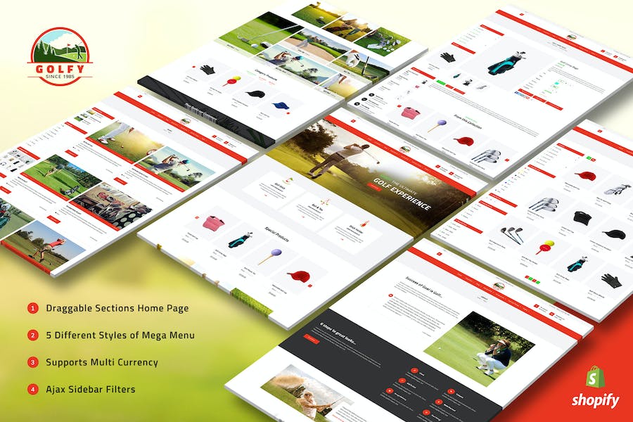 Golfy is a gorgeous and stylish sports Shopify theme created for launching your own online store for selling sports equipment,accessories,and sportswear. The theme has highly modern and superbly functioning design,therefore you can show your products grandly with new trending styles. Besides,the themes mega menu displays your product images and categories with an excellent look. Plus,the theme’s slideshow is highly smart and shows your products lively with smooth transition effects you never have seen before. Using the above features,you can make your clients stick with your website once forever. Not only that the theme is cross-compatible with all devices and browsers screens across the world. So the customers can see the products in a most attractive look with only one mouse click. Also,the theme has many more excellent features needed for your next online shop project! Make a scroll down and find out all of them.