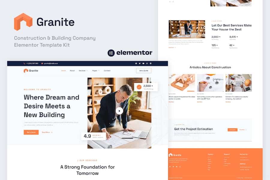 Granite - Construction & Building Company Elementor Template Kit created especially for construction company,architecture,industrial,manufacturing,mechanical,etc. Granite has a simple,modern and clean design with 100% responsive layout,and very easy to customize and can be used by anyone without having to understand coding.