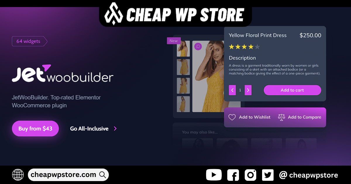 JetWooBuilder for Elementor is a must-have addon allowing to add fully-fledged WooCommerce pages built with Elementor,use them as templates,and create loads of attractive WooCommerce content with versatile WooCommerce widgets.nnnnNote: JetSmartFilter plugin is included absolutely free. With JetSmartFilter you can easily add any type of fast ajax filter to WooCommerce product pages.nnnnCreating WooCommerce content becomes a really easy task with JetWooBuilder. The plugin has everything one needs when building a WooCommerce-based online store with Elementor.nnnnIt allows creating product page and product archive templates with versatile layouts and structure. You won’t have any limits while building a WooCommerce page.nnnnThe process of implementing it is as easy as breathing,so one doesn’t need to learn coding skills in order to succeed.nnnnJetWooBuilder plugin is also a great asset when one needs specific WooCommerce dynamic widgets to add a purchasing button,product image or description.nn