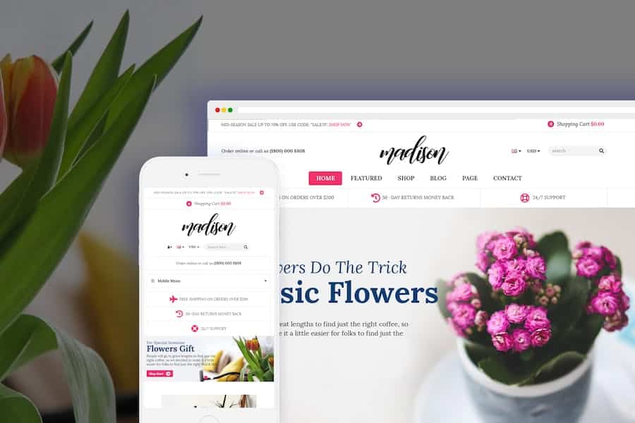 Madison is a responsive Shopify 2.0 theme tailored for flower,floral,plant,and beauty shops,as well as farm,garden tool,and equipment stores. The Madison theme boasts an array of top-notch features and powerful extensions,ensuring seamless performance on devices of varying screen sizes and web browsers.