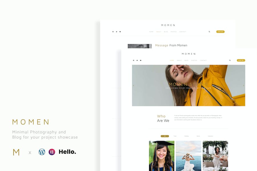 Momen is minimal Photography and Blog elementor theme for your project. It worked very well with latest wordpress and hello theme. Momen is light and easy to use,it is good starter for traveler,photographer,and blogger like you who wants to have showcase website.nThis theme also load with awesome feature such blog post,blog archive,gallery,404 Page,Search Result Page,Counter,and Testimonial. You may also add Shop Page if you like. Get Momen Elementor Kit now and start your showcase project.