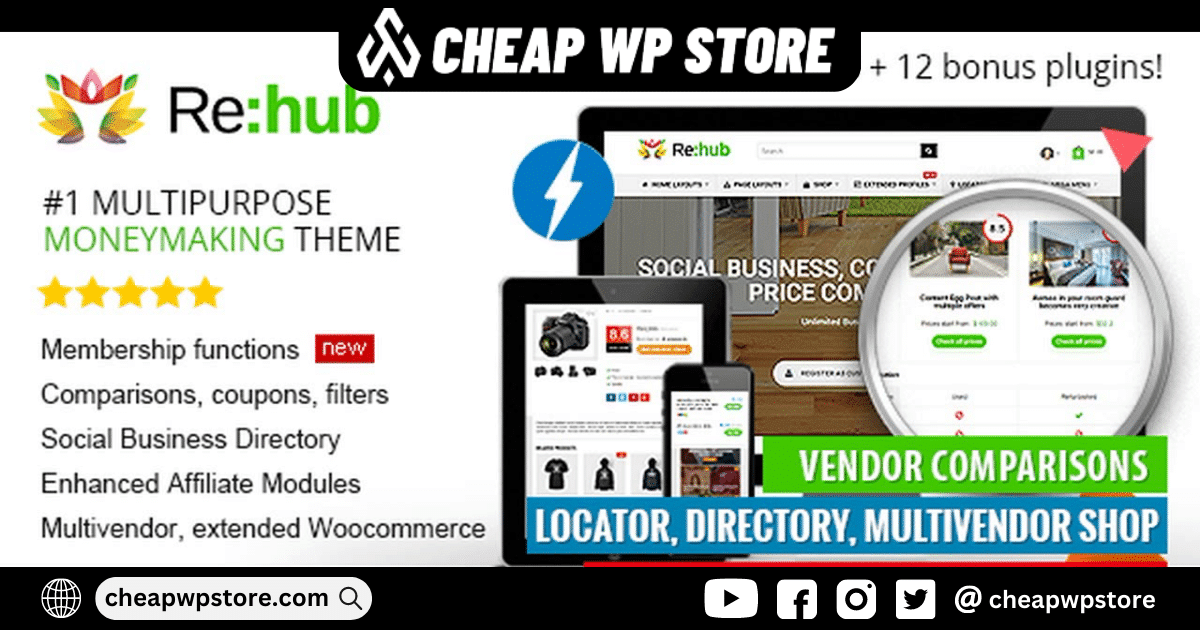 Looking for a powerful,reliable,and cost-effective way to take your website to the next level? Look no further than REHub WordPress Theme - Price Comparison,Affiliate Marketing,Multi Vendor Store,Community Theme,the ultimate solution for anyone looking to boost their online presence and drive more traffic to their site.nnWith REHub WordPress Theme - Price Comparison,Affiliate Marketing,Multi Vendor Store,Community Theme,you'll get access to a wide range of powerful features and tools designed to help you optimize your site for maximum visibility and search engine rankings. Whether you're looking to increase your site's speed and performance,enhance your site's design and functionality,or simply improve your site's overall user experience,REHub WordPress Theme - Price Comparison,Affiliate Marketing,Multi Vendor Store,Community Theme has everything you need to succeed.nnAnd best of all,when you subscribe to our Membership Plans,you'll get access to REHub WordPress Theme - Price Comparison,Affiliate Marketing,Multi Vendor Store,Community Theme and over 1500+ other products for FREE! That's right,for one low weekly/monthly/annually/lifetime price,you'll get unlimited access to all of our plugins and themes without serial codes,including all future releases. Plus,you'll enjoy unlimited domain usage and regular updates as soon as they become available - usually on a daily basis!nnSo why wait? Join the club today and start enjoying all the benefits of our powerful Membership Plans. With REHub WordPress Theme - Price Comparison,Affiliate Marketing,Multi Vendor Store,Community Theme and our other amazing products,you'll have everything you need to take your website to the next level and achieve online success. But don't just take our word for it - read our Terms & Conditions and FAQ before purchase and see for yourself why so many website owners trust us for all their needs!