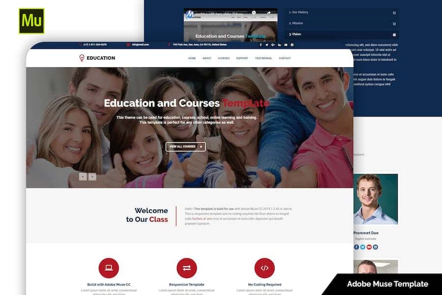 This responsive Education muse template is best suitable for education,courses,business school website,agency,business,books,internet,design websites,science,charity,corporate websites and portfolio. It’s also can be used for any type of website.It is a clean and modern template. Education muse template is based on 1170 grid and it is responsive,with this template your site is best on every device. Education muse template creates with Adobe Muse CC 2015.1.2.44 .You can get education websites of any good designed with Education muse template and you can edit each and every part of this template according to your needs.