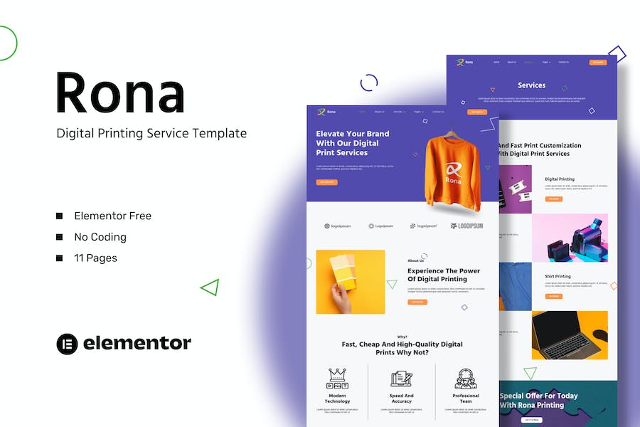 Rona - Digital Printing Service Template Kits is an Elementor Template Kit for quickly and easily creating websites for your business using the Elementor Page Builder plugin for WordPress. This is not a WordPress theme. Template Kits contain page content for Elementor page builder. This kit has been optimized for use with the free Hello Elementor theme but may be used with most themes that support Elementor.