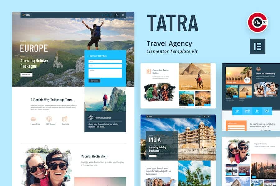Tatra- Travel Agency Template Kit is an amazing new creative travel agency WordPress Elementor template kit. This is powerful and quick to develop a site for not only travel but for every tourism business. This is an Elementor template kit that will help to showcase your packages and services. Tatra- Travel Agency Template Kit includes pages like About us,package list,reviews,Package Info,and Contact us. Various Home layout helps you to showcase your agency. Tatra- Travel Agency Template Kit comes with a modern and clean design with a huge set of contemporary layouts designed to help you create a powerful showcase website. You can change the look and feel. No need to understand codding. It builds for one of the popular drag and drops page builder Elementor. A quick way to build your website.