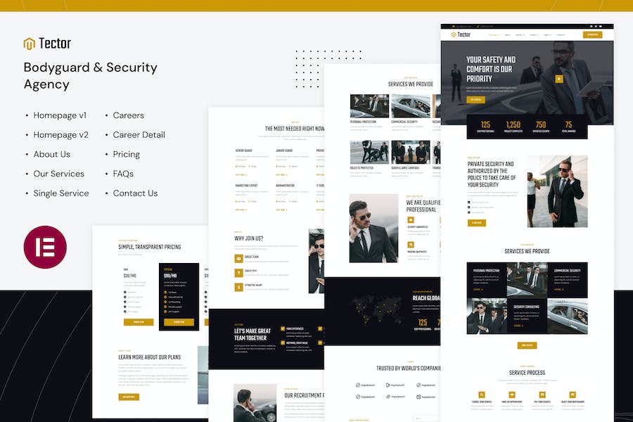 Tector is a modern and clean Elementor Pro Template Kit that perfect for those who want to create a professional-looking WordPress-based website for a security & protection services company,private investigators,bodyguard services,and security systems companies. This template has a professional design with a 100% responsive layout,retina-ready,and very easy to customize because using Elementor so you don’t need a single line of coding!