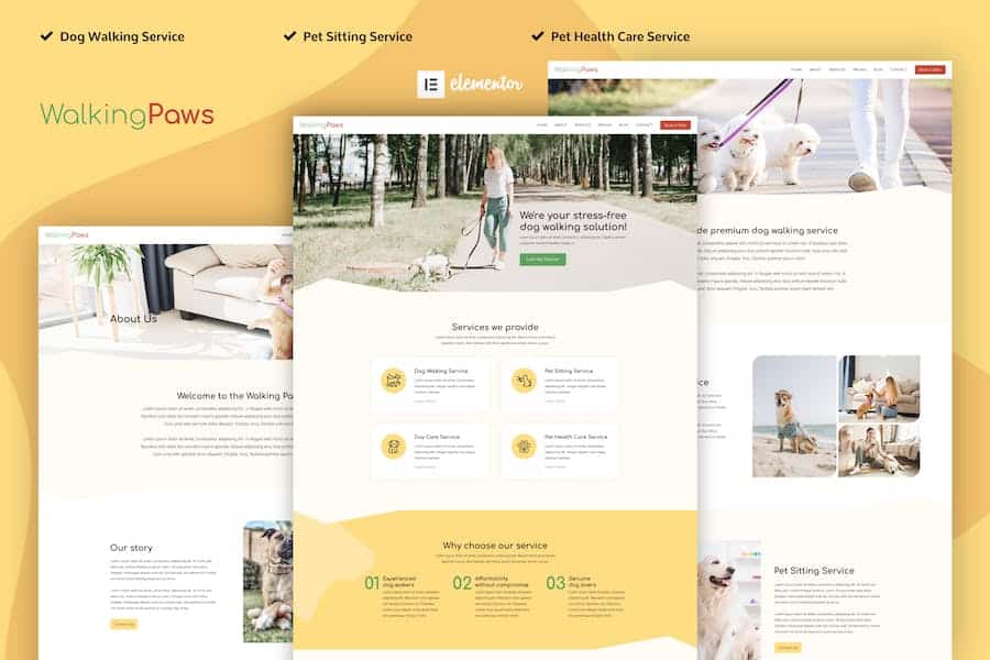Walking Paws is an Elementor Template Kits build for dog walking and pet care service business. The template is pixel-perfect well designed and makes sure you can create your website without touching a line of code. Especially designed and tailored for pet care services,you will find all the essential features to make your website a success.