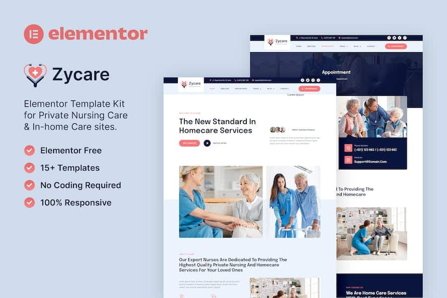 Introducing Zycare,the modern Elementor Template Kit for building anprofessional-looking website for home care and private nursing agencies.nShowcase your professional services online with ease using our fullynresponsive,retina-ready template. Perfect for home care agencies,privatennurses,senior care services,elderly home care,and in-home health carenproviders,this template is easy to customize with Elementor - no codingnrequired!